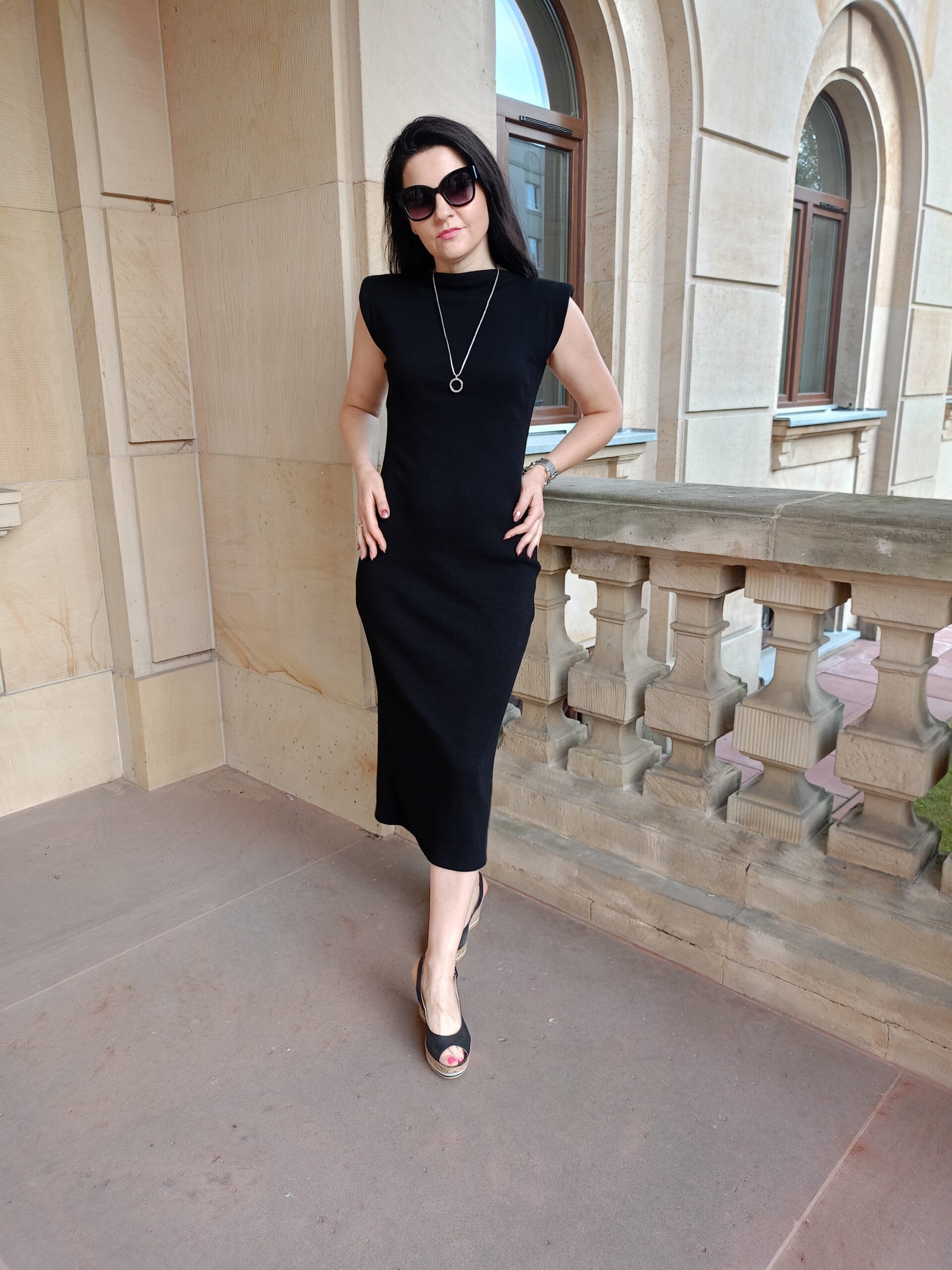 Długość midi z rozcięciem z tyłu wspaniale wydłuża sylwetkę, a wysoki dekolt to klasa sama w sobie.
