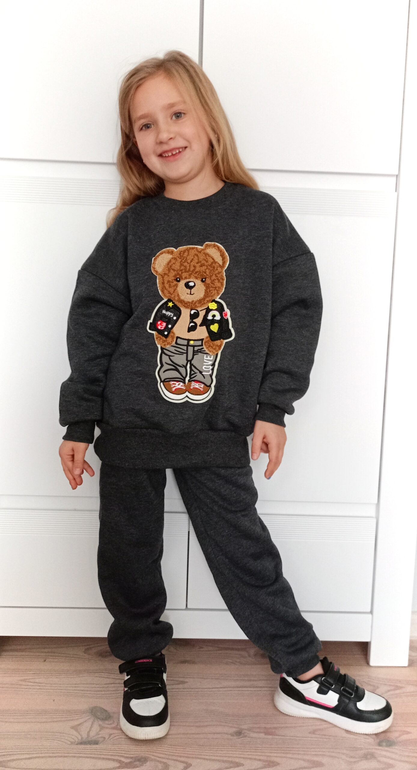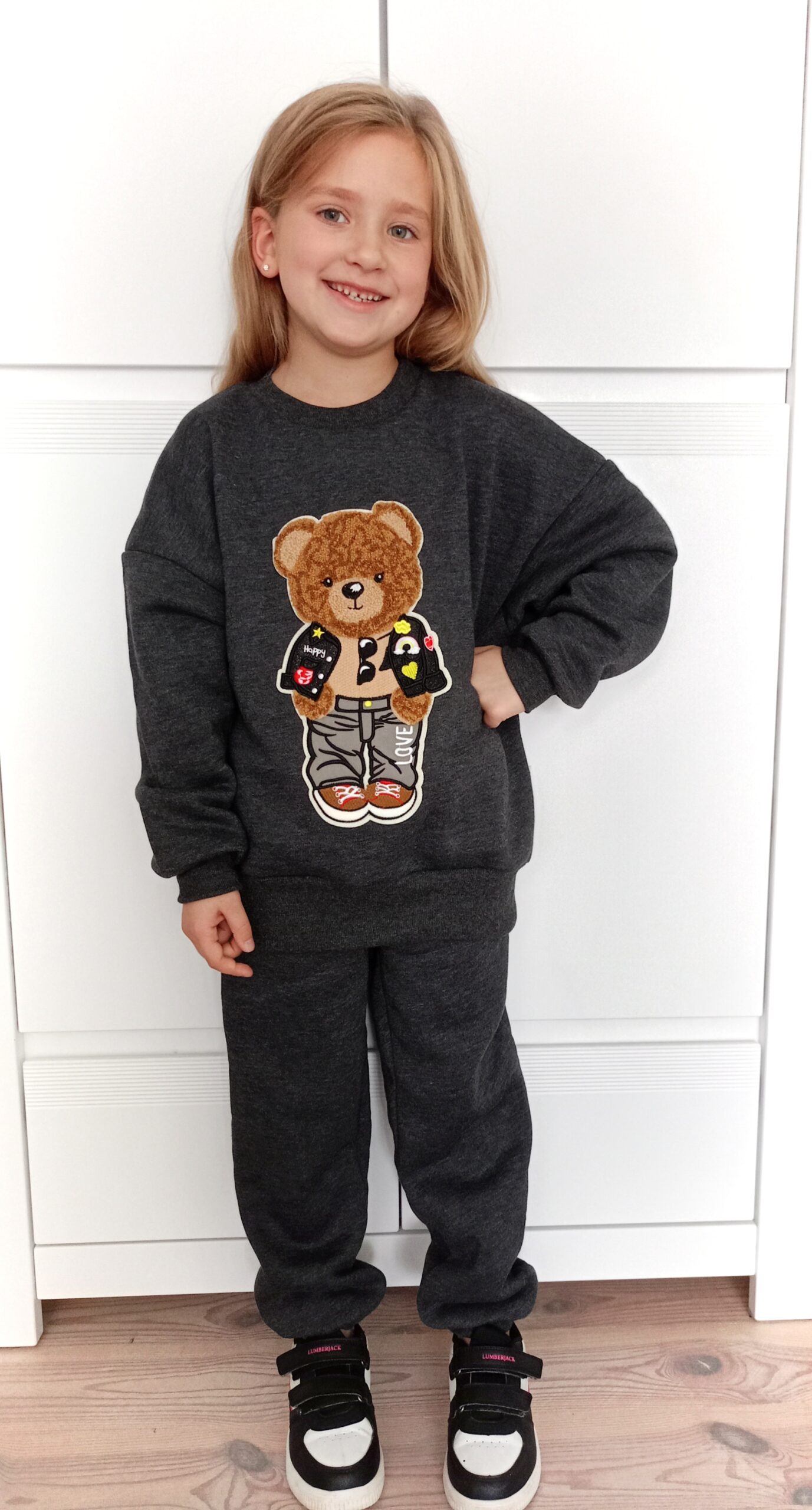 Uszyta z grubej, miękkiej i niezwykle przyjemnej bawełnianej dzianiny dresowej z tzw. meszkiem od środka, przyjemnej dla skóry dziecka.