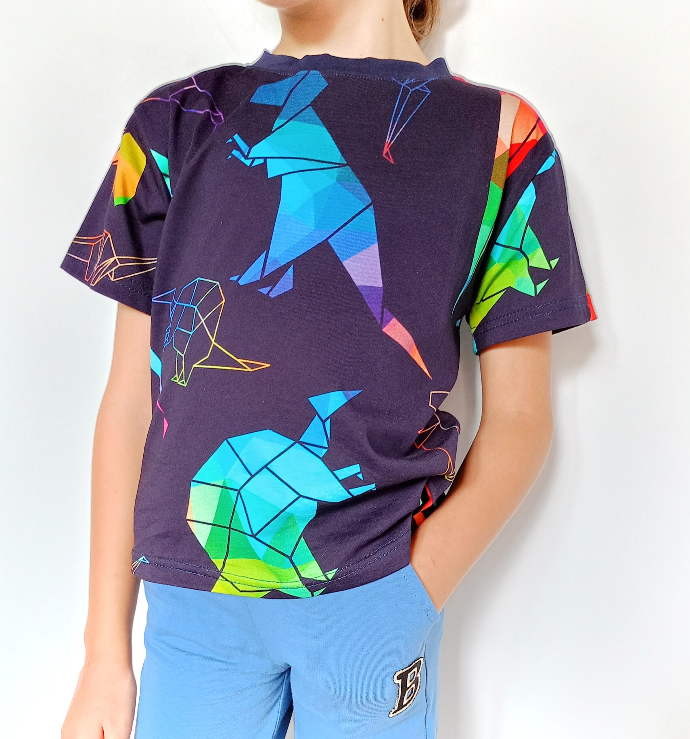 Nasza bawełniana koszulka stworzona została dla miłośników tych  gigantów. Duże geometryczne dinozaury przypadną do gustu niejednemu łobuzowi:)